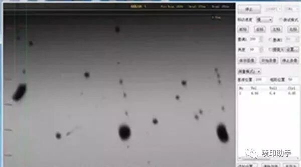电压过高是飞墨真正的元凶,当你电压过高时,喷头内的压电陶瓷震荡幅度过大,墨滴喷射的时候容易产生拖尾,墨滴的拖尾在图像上表现就是飞墨,下图可以观察到墨滴的后面跟随着好多小墨滴。