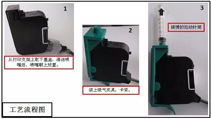 处理方法为,使用抽气夹具抽出打印墨盒内的气体,参考下图所示。